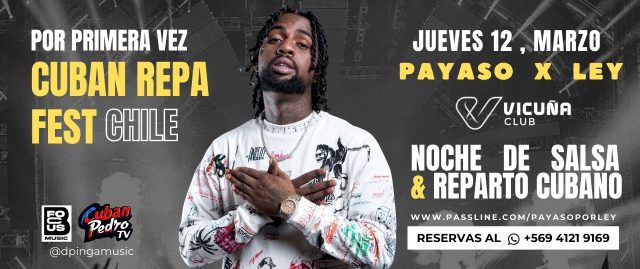 Llega a Chile el Primer "Cuban Repa Fest" con el fenómeno PAYASO x LEY El próximo jueves 12 de marzo, la capital chilena experimentará un sismo de ritmo y sabor. Vicuña Club será el epicentro del Cuban Repa Fest, el primer festival dedicado íntegramente al "Reparto", el género urbano-cubano que está revolucionando las pistas de baile...